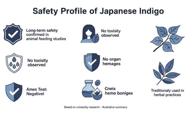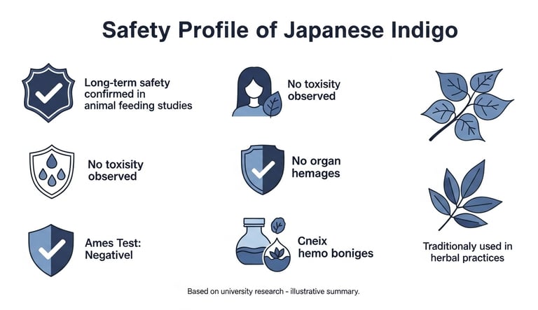 Safety evaluations confirm that indigo leaf powder is non-toxic, non-carcinogenic, and suitable as a long-term functional food.